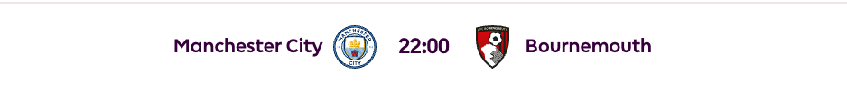 - Match Result: City (-215), Draw (+375), Bournemouth (+550)